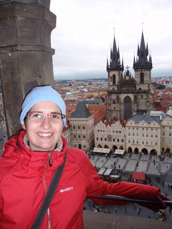 En la torre del Staroměstská radnice compramos las entradas para subir a lo alto, a la que se accedía por un edificio aledaño. Praga es conocida como la “ciudad de las 100 torres”, y queríamos subir a alguna para contemplar el panorama. Y la verdad es que la vista de 360º no nos defraudó: se podía disfrutar de una gran panorámica hacia el este, donde se veía gran parte de la Staroměstské náměstí y las iglesias de Matky Boží před Týnem y sv. Mikuláše. Ésta era la vista más popular, donde la aglomeración de gente hacía difícil pasar por el estrecho pasadizo de la cumbre de la torre. Hacia el oeste la vista también era interesante, aunque no tan bonita: se veía al fondo el Hradčany y la colina de Petřín, y fijándose mucho se podía ver el Karlův most. Aunque puede ser agobiante por las aglomeraciones, es muy recomendable subir a la torre, las vistas son de 10!