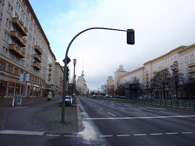 Luego fuimos a la cercana estación de Ostbahnhof, donde cogimos un S-bahn hasta la de Alexanderplatz. La plaza, en la que habíamos estado dos días atrás, estaba un poco adormilada, sin vida. Nos internamos por el barrio de Friedrichshain, el antiguo barrio obrero del Berlín oriental. En él, el régimen comunista construyó la Karl-Marx-Allee, una gran avenida monumental llamada inicialmente Stalinallee. Pasear por aquella avenida nos gustó mucho, fue como transportarnos a otro país y otra era. No tiene nada que ver a cualquier otra parte de la ciudad, es muy singular. La calle es anchísima, rodeada por robustos edificios de viviendas de estilo socialista (sobrias y funcionales). La única concesión estética eran las torres de la Strausberger Platz y de la Frankfurter Tor, a la que no llegamos.