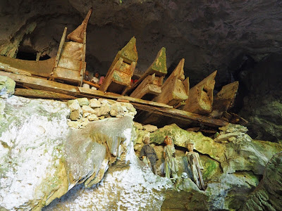 Después de un par de horas dejamos Bolu y fuimos a ver las cuevas de Londa, un importante centro de enterramientos toraja. Es obligatorio visitarlas con guía, al que hay que pagarle el coste de la lámpara de aceite (30.000 rupias) y la voluntad (en nuestro caso, 60.000), además de pagar 20.000 rupias de entrada. A la entrada de la cueva había algunos tau-tau modernos muy realistas, parecían personas de carne y hueso. La cueva es un enorme cementerio, con algunos ataúdes tan viejos y echos polvo que dejaban ver los huesos que había dentro. Era frecuente ver cigarrillos y monedas encima de ellos, eran ofrendas a los muertos, objetos que necesitarían en la otra vida. El guía estaba mas preocupado en hacernos fotos que en explicarnos cosas interesantes. Por eso la visita a Londa nos dejó un poco indiferentes, nos esperábamos un poco mas.